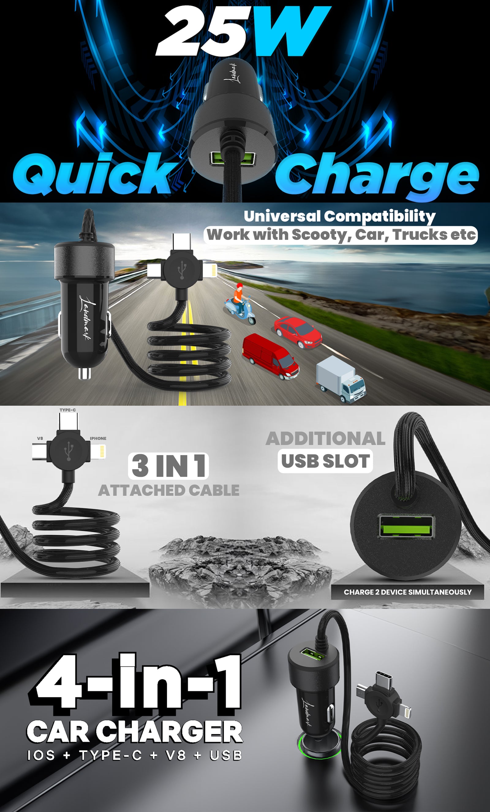 4 in 1 Car Charger: This isn't just any car charger. It's a 4 in 1 powerhouse that combines versatility with performance, ensuring all your charging needs are covered in one compact device.