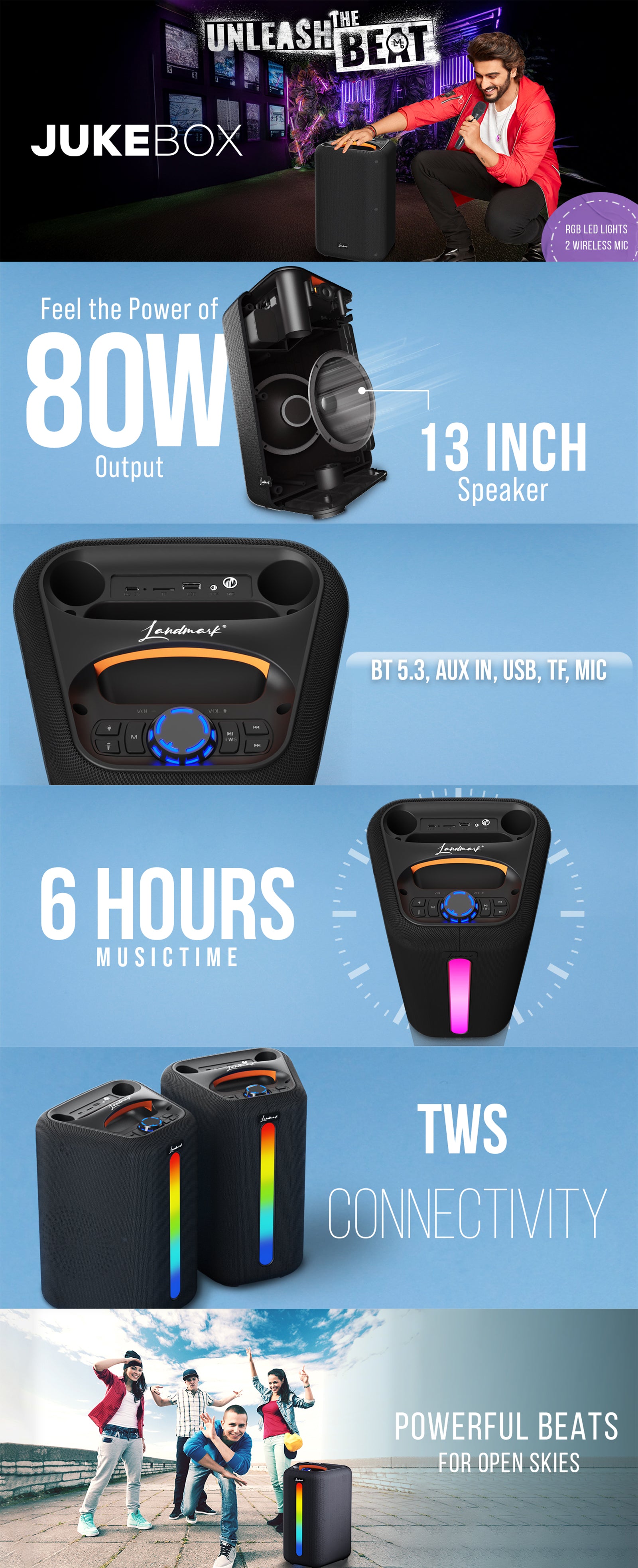 Landmark JukeBox TBS 7095 Party Speaker 80W with 13-Inch Driver, Dual Wireless Mics, RGB Lights, and Bluetooth 5.3 (Black)