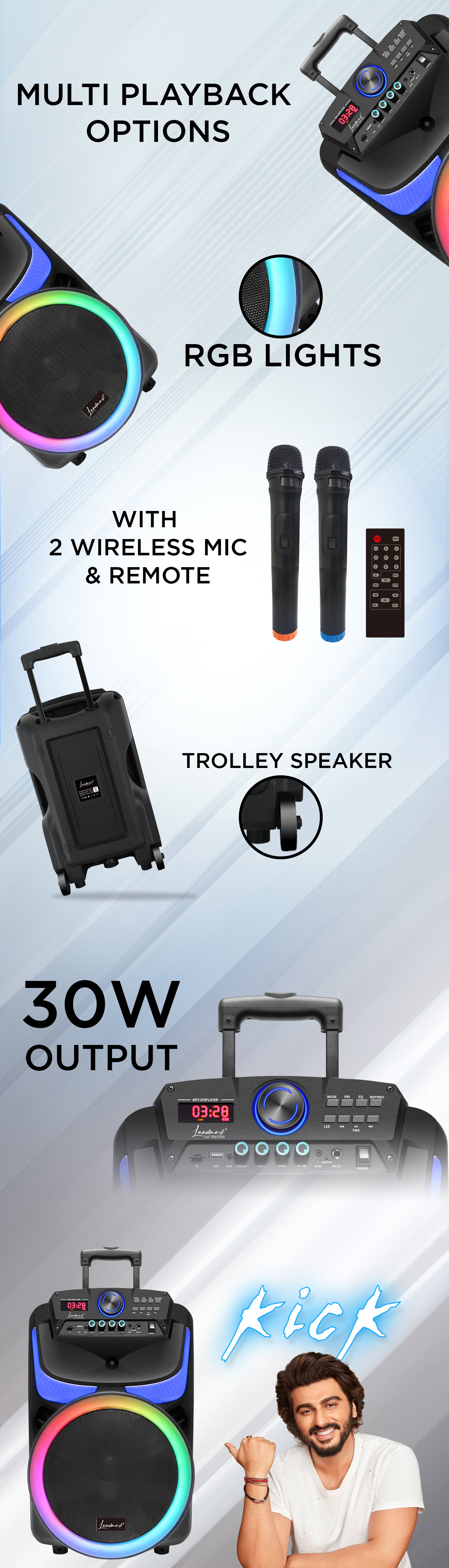 Make your parties unforgettable with the LM TBS7055 Kick Party Speaker. This dynamic speaker delivers a booming 30W output and is packed with multiple functions and modes to elevate your gatherings. With vibrant RGB lights and the added convenience of 2 wireless microphones and a remote control, this party speaker is your ultimate entertainment companion. Available in a sleek Black color.
