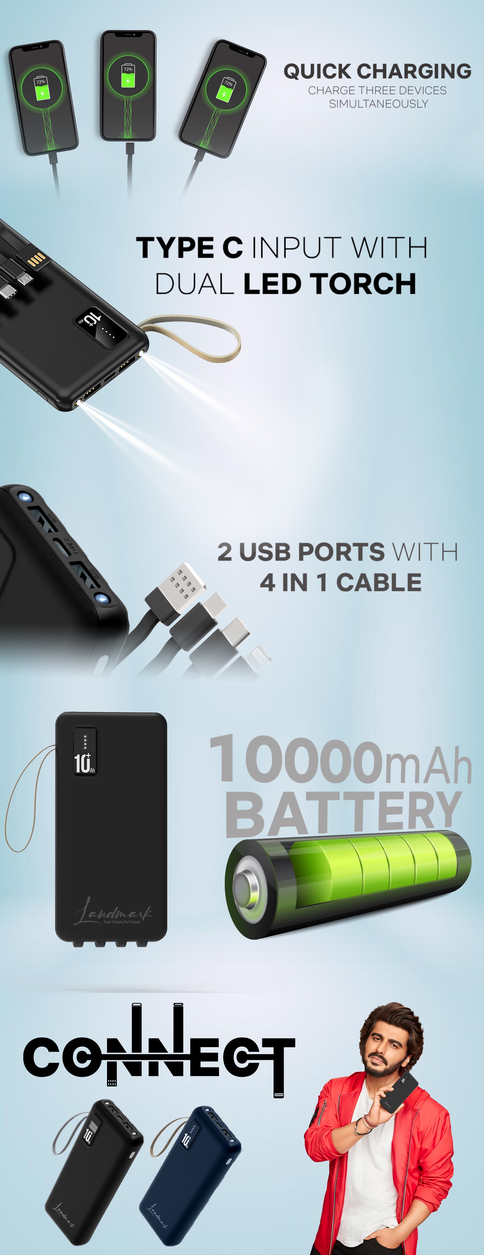 Rejuvenate your phone's energy with the robust 10000 mAh high-density battery, ensuring all your devices receive the charge they deserve. The Connect Powerbank boasts cutting-edge Smart IC technology, a guardian of your mobile's battery life. It ensures the maximum charging rate without affecting your device, resulting in longer-lasting battery performance.