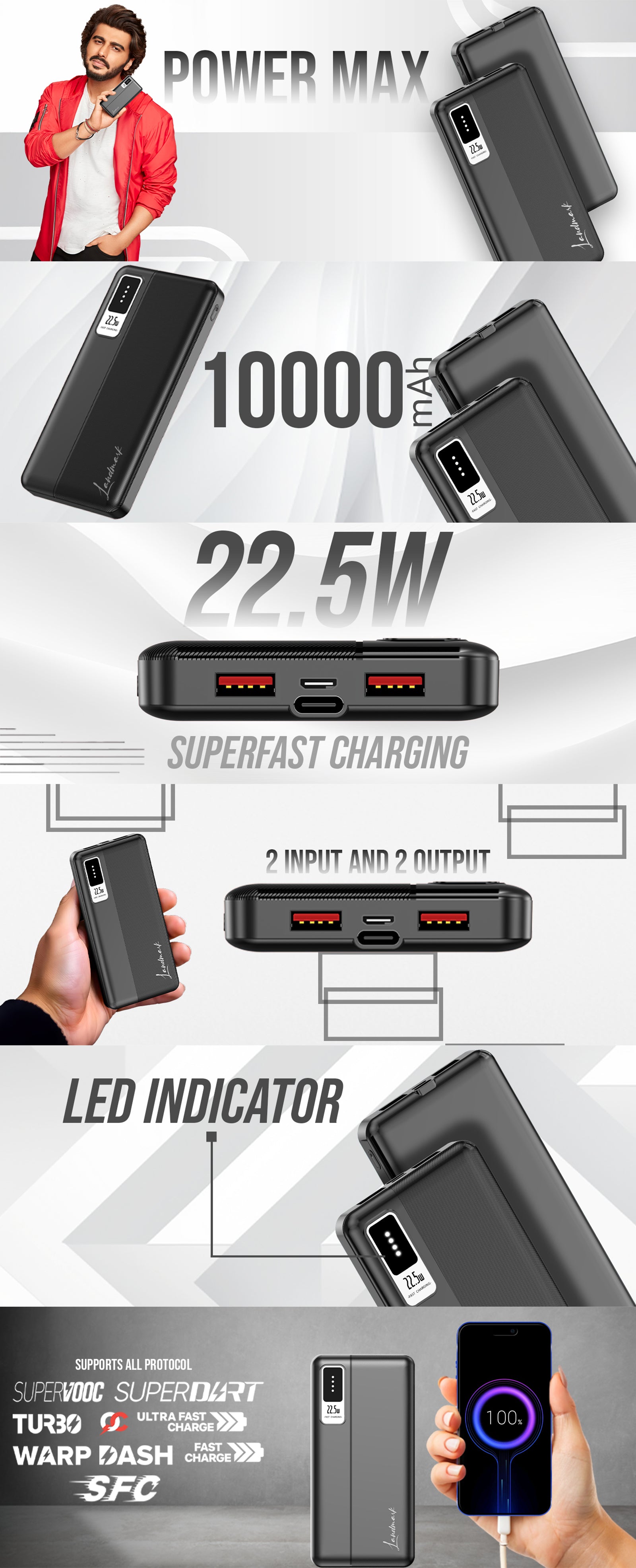Landmark Power Max 22.5W Power Bank is a compact and powerful charging solution designed for all your portable charging needs. With a sleek, ergonomic design and a textured matte finish, it combines functionality with style. The power bank features dual input Type-C & V8 and dual output USB-A, supporting all major charging protocols for fast and efficient charging. Its 10000mAh capacity ensures your devices stay powered throughout the day.