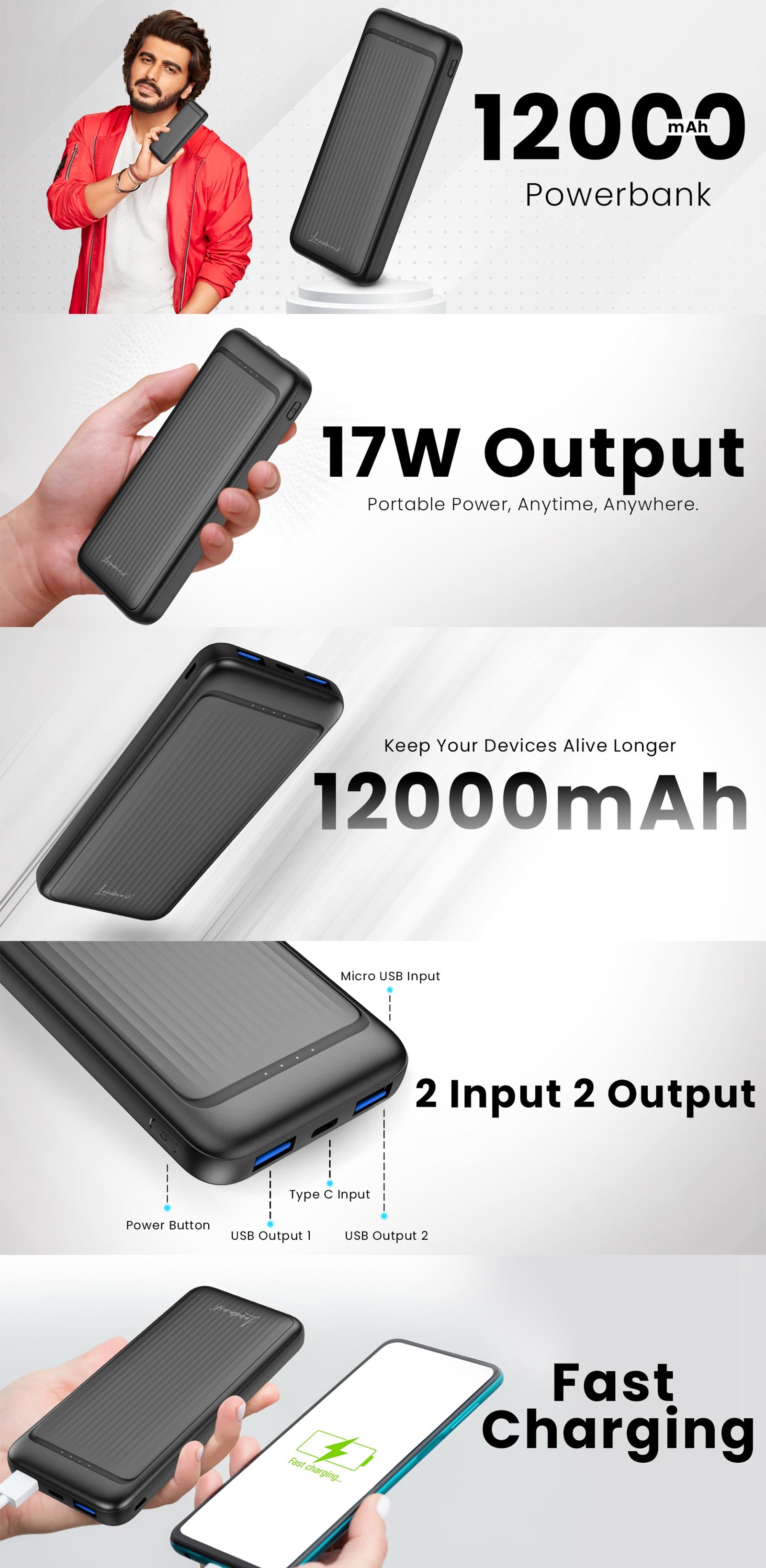 Landmark 17W Power Bank is a Made in India product designed to meet your charging needs with style and efficiency. With a massive 12000 mAh battery capacity, it supports 2 input options Type-C and V8 and 2 USB-A output ports, making it compatible with a wide range of devices. Equipped with fast-charging technology, it ensures quick power-ups for your gadgets anytime, anywhere. Its sleek, textured design is lightweight and portable, combining modern aesthetics with practicality.