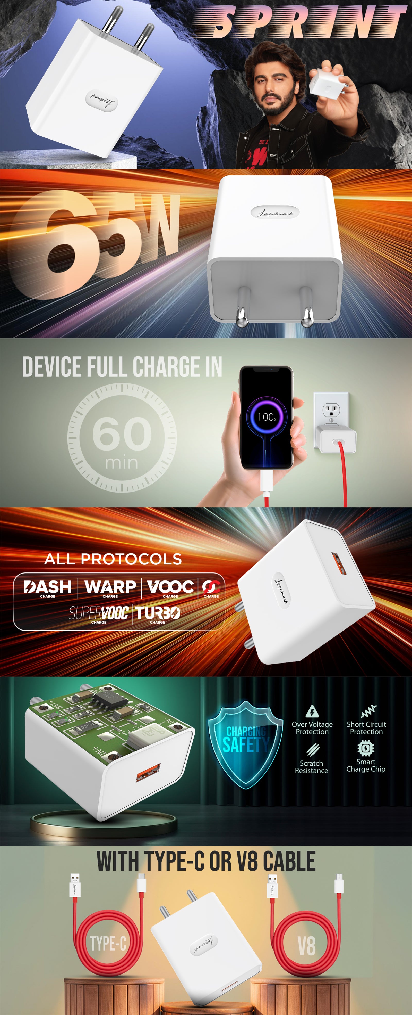 Landmark Sprint 65W Charger, is a sleek and compact fast charger designed for seamless compatibility with multiple charging protocols, including DASH, WARP, VOOC, and SUPERVOOC. Built with a modern design and sturdy build, this charger pairs a white matte finish with a bright red V8 cable, delivering both style and functionality. Made in India, it ensures reliable performance, catering to a wide range of devices for fast and efficient charging.